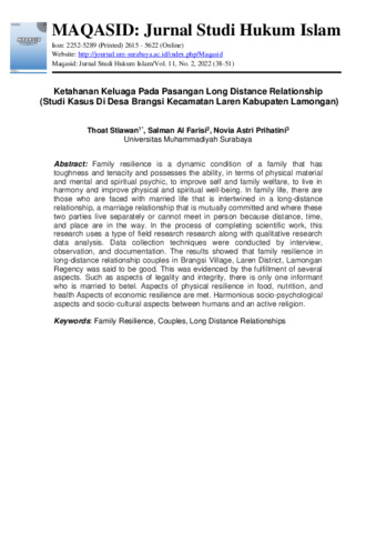 swiatan, thoat and Al Farisi, Salman and Astri Prihatini, Novia (2022) Ketahanan Keluaga Pada Pasangan Long Distance Relationship (Studi Kasus Di Desa Brangsi Kecamatan Laren Kabupaten Lamongan). MAQASID: Jurnal Studi Hukum Islam, 11 (2). pp. 38-51. ISSN ISSN: 2252-5289 (Printed) 2615 - 5622 (Online)