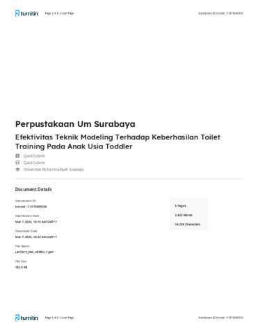 Suswojo, Heru and Festi, Pipit and Holifah, Nurul and Marini, Gita and Nasrullah, Dede (2024) Efektivitas Teknik Modeling Terhadap Keberhasilan Toilet Training Pada Anak Usia Toddler. Efektivitas teknik modeling terhadap keberhasilan toilet training pada anak, 9 (4). pp. 210-214. ISSN ISSN Print: 2541-2396 ISSN Online: 2597-7539