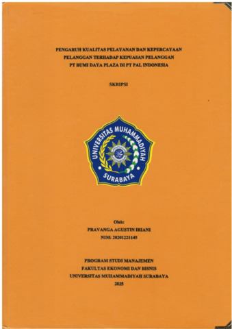 Iriani, Pravanga Agustin (2025) Pengaruh Kualitas Pelayanan dan Kepercayaan Pelanggan terhadap Kepuasan Pelanggan PT Bumi Daya Plaza di PT PAL Indonesia. Undergraduate thesis, Universitas Muhammadiyah Surabaya.