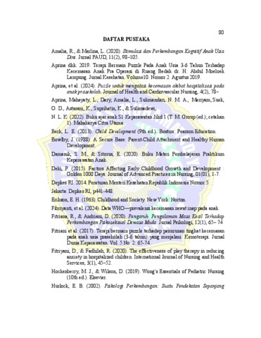 | Uncontrolled Keywords: | Anak usia pra sekolah, kecemasan, hospitalisasi, terapi bermain, puzzle, Preschool children, anxiety, hospitalization, play therapy, puzzles |