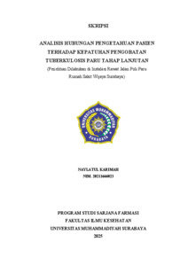 Karimah, Naylatul (2025) Analisis Hubungan Pengetahuan Pasien terhadap Kepatuhan Pengobatan Tuberkulosis Paru Tahap Lanjutan (Penelitian di Instalasi Rawat Jalan Poli Paru Rumah Sakit Wijaya Surabaya). Undergraduate thesis, Universitas Muhammadiyah Surabaya.