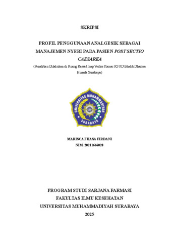 Firdani, Marisca Fhasa (2025) Profil Penggunaan Analgesik sebagai Manajemen Nyeri pada Pasien Post Sectio Caesarea (Penelitian Dilakukan di Ruang Rawat Inap Verlos Kamer RSUD Bhakti Dharma Husada Surabaya). Undergraduate thesis, Universitas Muhammadiyah Surabaya.