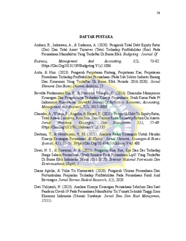 Return on Asset is a profitability ratio used to measure the extent to which a company is able to generate net profit from its total assets. This study aims to analyze the effect of Firm Size, Debt to Equity Ratio, and Inventory Turnover on Return on Assets in pharmaceutical companies listed on the Indonesia Stock Exchange (IDX) during the