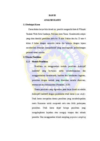 Pendahuluan: Masa prasekolah disebut sebagai masa keemasan (Golden Age), di mana fungsi psikis dan fisik anak mulai berkembang dengan merespons lingkungan sekitar dan mengintegrasikan pengalaman tersebut ke dalam diri mereka. Anak yang mengalami hambatan dalam perkembangan personal sosial cenderung menunjukkan perilaku seperti mudah marah, menantang, sering menangis, hingga merasa cemas saat berinteraksi. Jika aspek ini tidak terpenuhi, anak bisa menjadi pasif, takut, dan kurang inisiatif. Tujuan: Tujuan penelitian ini untuk mengetahui perkembangan personal sosial pada anak dengan ibu bekerja di Tambak Wedi Surabaya. Metode: Metode penelitian menggunakan deskriptif kualitatif dengan pendekatan studi kasus. Subjek penelitian terdiri dari dua anak prasekolah usia (3-6) tahun (An. R usia 3 tahun dan An.D usia 4 tahun 6 bulan), yang dipilih menggunakan teknik purposive sampling berdasarkan kriteria tertentu, yaitu memiliki ibu yang bekerja. Pengumpulan data dilakukan melalui observasi, wawancara, dan pengukuran perkembangan menggunakan instrumen Denver Developmental Screening Test II (DDST II). Hasil: Menunjukkan variasi perkembangan: An. R berada pada kategori Keterlambatan (Delay), ditandai dengan penolakan berpakaian dan ketidakmandirian makan. Sementara An. D berada pada kategori Normal. Meskipun demikian, kedua responden memiliki kelemahan yang sama pada aspek kemandirian, yaitu belum mampu mengambil makan sendiri. Faktor yang memengaruhi perkembangan anak meliputi pola asuh meliputi jam kerja, ketersediaan waktu ibu, serta stimulasi yang diberikan di rumah. Diskusi: Keterlambatan kemandirian anak sangat erat kaitannya dengan jam kerja ibu yang panjang, yang memicu kelelahan dan stres. Keadaan ini mendorong ibu/pengasuh untuk melakukan perilaku melayani (seperti menyuapi) demi efisiensi waktu, sehingga secara signifikan menghambat peluang anak mengembangkan inisiatif dan otonomi yang merupakan tugas perkembangan utama usia prasekolah..