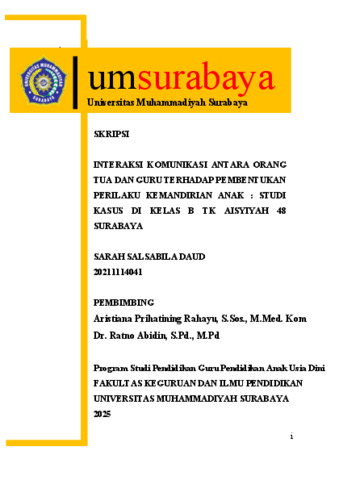 Daud, Sarah Salsabila (2025) Interaksi Komunikasi antara Orang Tua dan Guru terhadap Pembentukan Perilaku Kemandirian Anak: Studi Kasus di Kelas B TK Aisyiyah 48 Surabaya. Undergraduate thesis, Universitas Muhammadiyah Surabaya.