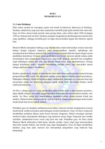 Museum Musik merupakan tempat melestarikan dan mempamerkan musik dan alat musik, sekaligus tempat pertunjukan musik, sumber informasi, hiburan dan informasi. Museum merupakan sarana informasi secara lebih menarik, interaktif dan menghibur, tanpa menghilangkan makna dan nilai sejarah dari benda yang dipamerkan. Museum musik tidak hanya melestarikan atau mengoleksi musik dan alat musik, tetapi juga menyediakan tempat berbagai genre music yang dapat dipamerkan melalui pameran. Itu sebabnya diperlukan museum musik di kota Surabaya agar masyarakat menjadi lebih mengenal ragam musik dan dapat mengenang masa-masa kejayaan musik pada masa itu. Untuk mengatasi hal ini perlunya sebuah wadah untuk menyimpan dan mengumpulkan informasi dan data tersebut. Wadah tersebut adalahMuseum Musik Indonesia. Dengan pendekatan Arsitektur Art Deco. Rancangan Bangunan Museum Musik dengan Gaya Art Deco di Surabaya merupakan upaya untuk mengintegrasikan keindahan arsitektur klasik Art Deco dengan fungsi modern sebagai wadah pengapresiasian dan preservasi warisan musik di kota Surabaya. Bangunan ini mencakup analisis desain yang menggabungkan elemen-elemen khas Art Deco, seperti garis-garis geometris, ornamen artistik, dan penggunaan bahan berkualitas tinggi, dengan kebutuhan kontemporer untuk ruang pameran, studio rekaman, dan ruang konser. Dengan menggali inspirasi dari era keemasan Art Deco, rancangan ini bertujuan untuk menciptakan lingkungan yang memikat, fungsional, dan mendukung pengalaman yang memuaskan bagi pengunjung, sambil meresapi kekayaan sejarah musik Surabaya.