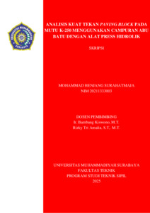 Surahatmaja, Mohammad Henjang (2025) Analisis Kuat Tekan Paving Block pada Mutu K-250 Menggunakan Campuran Abu Batu dengan Alat Press Hidrolik. Undergraduate thesis, Universitas Muhammadiyah Surabaya.