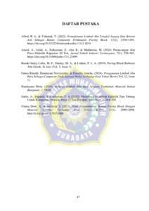 | Uncontrolled Keywords: | Paving block, abu batu, kuat tekan, daya serap air, alat press hidrolik, Paving Block, Stone Ash, Compressive Strength, Water Absorption, Hydraulic Press |