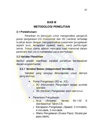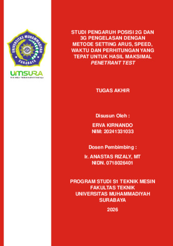 Kirnando, Erva (2026) Studi Pengaruh Posisi 2G dan 3G Pengelasan dengan Metode Setting Arus, Speed, Waktu dan Perhitungan Yang Tepat Untuk Hasil Maksimal Penetrant Test. Undergraduate thesis, Universitas Muhammadiyah Surabaya.