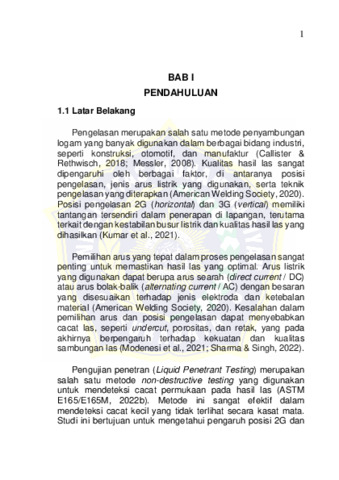 Penelitian ini bertujuan untuk menganalisis pengaruh posisi pengelasan 2G dan 3G serta variasi arus listrik terhadap kualitas hasil pengelasan baja karbon rendah menggunakan metode Shielded Metal Arc Welding (SMAW). Material yang digunakan adalah baja karbon rendah dengan ketebalan 8 mm dan elektroda E6013 berdiameter 3,2 mm. Variasi arus pengelasan meliputi 80 A, 90 A, dan 100 A pada posisi horizontal (2G) dan vertikal (3G). Kualitas hasil las diuji menggunakan metode non-destruktif Liquid Penetrant Test (LPT) untuk mendeteksi cacat permukaan.