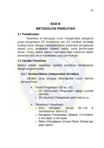 Hasil penelitian menunjukkan bahwa posisi pengelasan dan besar arus listrik berpengaruh signifikan terhadap kualitas sambungan las. Posisi 2G menghasilkan kualitas las lebih baik dibandingkan posisi 3G karena kestabilan kolam las lebih mudah dikendalikan. Arus 80 A menghasilkan penetrasi dangkal dan cacat lack of fusion, sedangkan arus 100 A menimbulkan cacat overlap, slag inclusion, dan porositas. Arus 90 A memberikan penetrasi optimal dengan cacat minimal. Jenis cacat yang ditemukan meliputi porositas, lack of fusion, crater defect, overlap, dan slag inclusion.