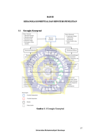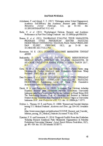 kepercayaan p> 0,05 untuk mengetahui hubungan antara burnout kegiatan akademik dengan indeks prestasi. Dan dari hasil persilangan tersebut diperoleh p = 0.350 pada exhaustion, p = 0.051 pada depersonalisasi, dan p = 0.312 untuk professional efficacy. Kesimpulan: penelitian ini dapat disimpulkan bahwa tidak ada hubungan yang bermakna antara burnout kegiatan akademik dengan indeks prestasi pada mahasiswa preklinik Fakultas Kedokteran UniversitasMuhammadiyah Surabaya.