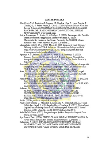 Permasalahan pengelolaan sampah yang semakin kompleks di Indonesia, terutama dalam memilah antara sampah organik dan anorganik, mendorong pengembangan sistem otomatis berbasis teknologi. Penelitian ini bertujuan untuk merancang dan mengembangkan sistem pemilah sampah otomatis dengan memanfaatkan kombinasi tiga jenis sensor: sensor proximity kapasitif, sensor proximity induktif, dan sensor suhu serta kelembapan DHT11. Ketiga sensor tersebut digunakan untuk mengidentifikasi karakteristik sampah berdasarkan parameter fisik dan lingkungan, seperti jarak deteksi dan kadar kelembapan, yang kemudian dianalisis menggunakan metode logika fuzzy untuk menghasilkan klasifikasi sampah yang akurat.