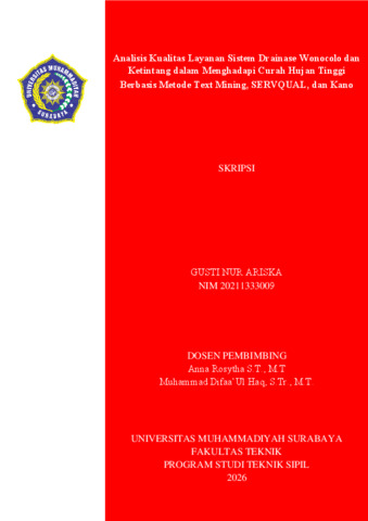 Ariska, Gusti Nur (2026) Analisis Kualitas Layanan Sistem Drainase Wonocolo dan Ketintang dalam Menghadapi Curah Hujan Tinggi Berbasis Metode Text Mining, SERVQUAL, dan Kano. Undergraduate thesis, Universitas Muhammadiyah Surabaya.
