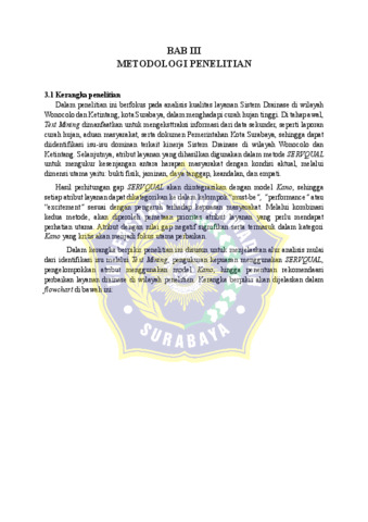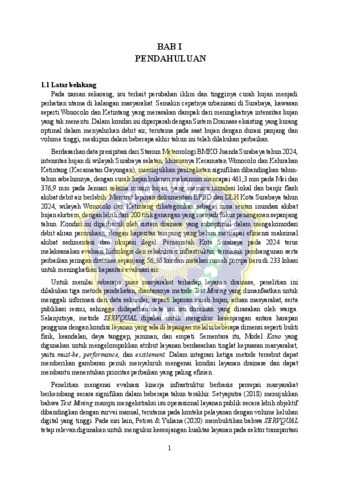 Wonocolo dan Ketintang di Surabaya Selatan sering mengalami genangan akibat curah hujan tinggi, yang mengganggu kenyamanan dan aktivitas masyarakat. Penelitian ini bertujuan mengevaluasi kualitas layanan sistem drainase untuk mengukur persepsi publik terhadap respons hujan ekstrem serta mengidentifikasi atribut layanan yang memengaruhi kepuasan. Metode integrasi text mining (analisis opini publik dari media sosial dan laporan sekunder), SERVQUAL (penilaian kesenjangan harapan• persepsi), dan model Kano (klasifikasi atribut kepuasan) diterapkan. Text mining mengidentifikasi 14 atribut dari 5 dimensi SERVQUAL, sementara SERVQUAL mengungkap gap rata-rata negatif pada dimensi reliability dan responsiveness. Model Kano mengklasifikasikan atribut sebagai one• dimensional, menunjukkan hubungan linear antara performa layanan dan kepuasan. Hasil menunjukkan layanan drainase belum optimal, dengan keluhan dominan pada kondisi keamanan drainase dan respons petugas lambat, yang menurunkan resiliensi hidraulik kawasan. Atribut prioritas seperti respons petugas bantu dan stabilitas sistem direkomendasikan sebagai dasar strategi perbaikan infrastruktur, termasuk rehabilitasi saluran dan integrasi teknologi cerdas untuk mitigasi genangan.