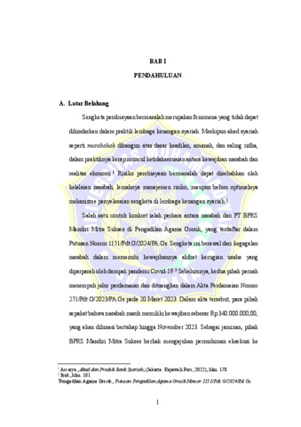 Based on these findings, this research recommended strengthening the mechanism for resolving problematic financing disputes in stages through optimizing preventive deliberations and restructuring financing, improving the quality of mediation in Religious Courts, strengthening the role of sharia arbitration as an alternative dispute resolution, and placing execution as a last resort that was proportionate and fair.