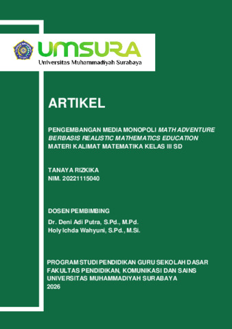 Rizkika, Tanaya (2026) Pengembangan Media Monopoli Math Adventure Berbasis Realistic Mathematics Education Materi Kalimat Matematika Kelas III SD. Jurnal Pemikiran dan Pengembangan Sekolah Dasar, 14 (1). ISSN P-ISSN 2338-1140 E-ISSN 2527-3043 (Unpublished)