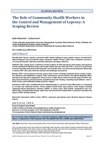 Srihartati, Enik and Dewi, Arlina The Role of Community Health Workers in the Control and Management of Leprosy: A Scoping Review. National Journal of Community Medicine, 16 (8). pp. 831-845. ISSN eISSN: 2229-6816, pISSN: 0976-3325)