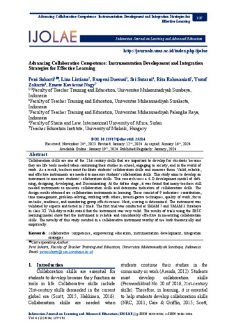 Peni Suharti, peni and lina, listiana and Ruspeni Desusi, Susi and Sri, Surtani and Rita, Rahmaniati and Yusuf, Zakaria and Emese, Kovácsné Nagy (2024) Advancing Collaborative Competence: Instrumentation Development and Integration Strategies for Effective Learning. Indonesian Journal on Learning and Advanced Education, 6 (1). pp. 137-152. ISSN p-ISSN 2655-920x, e-ISSN 2656-2804